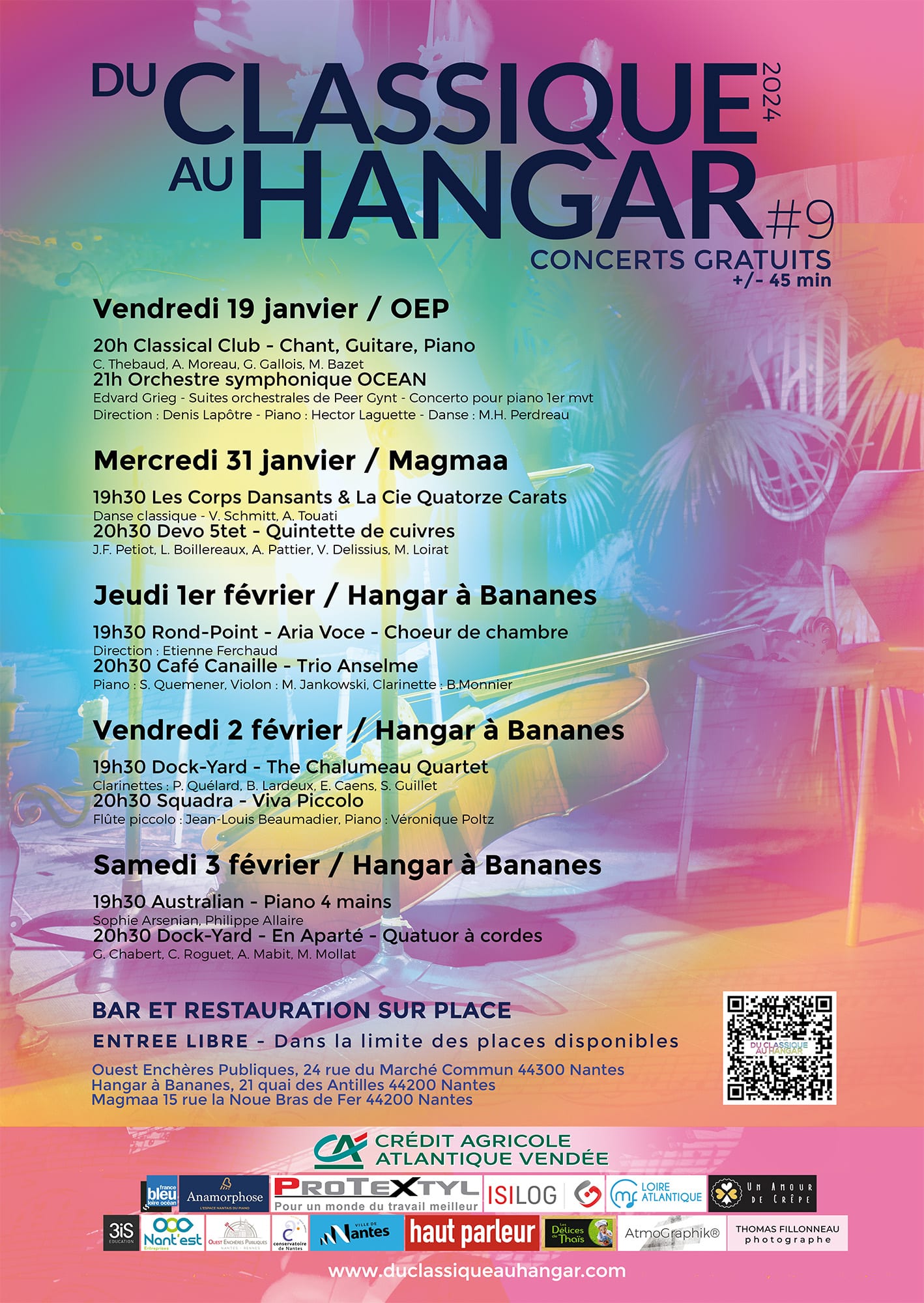 Pour la 9e édition, Du Classique au Hangar vous propose 3 sites nantais : le HANGAR A BANANES, ses bars et restaurants, MAGMAA le Food Hall de Nantes et un nouveau lieu : OEP – Ouest Enchères Publiques, un hôtel des ventes. 10 concerts gratuits en 5 soirs, où l’on casse les codes de la musique classique lors d’un apéro puis d’un dîner…