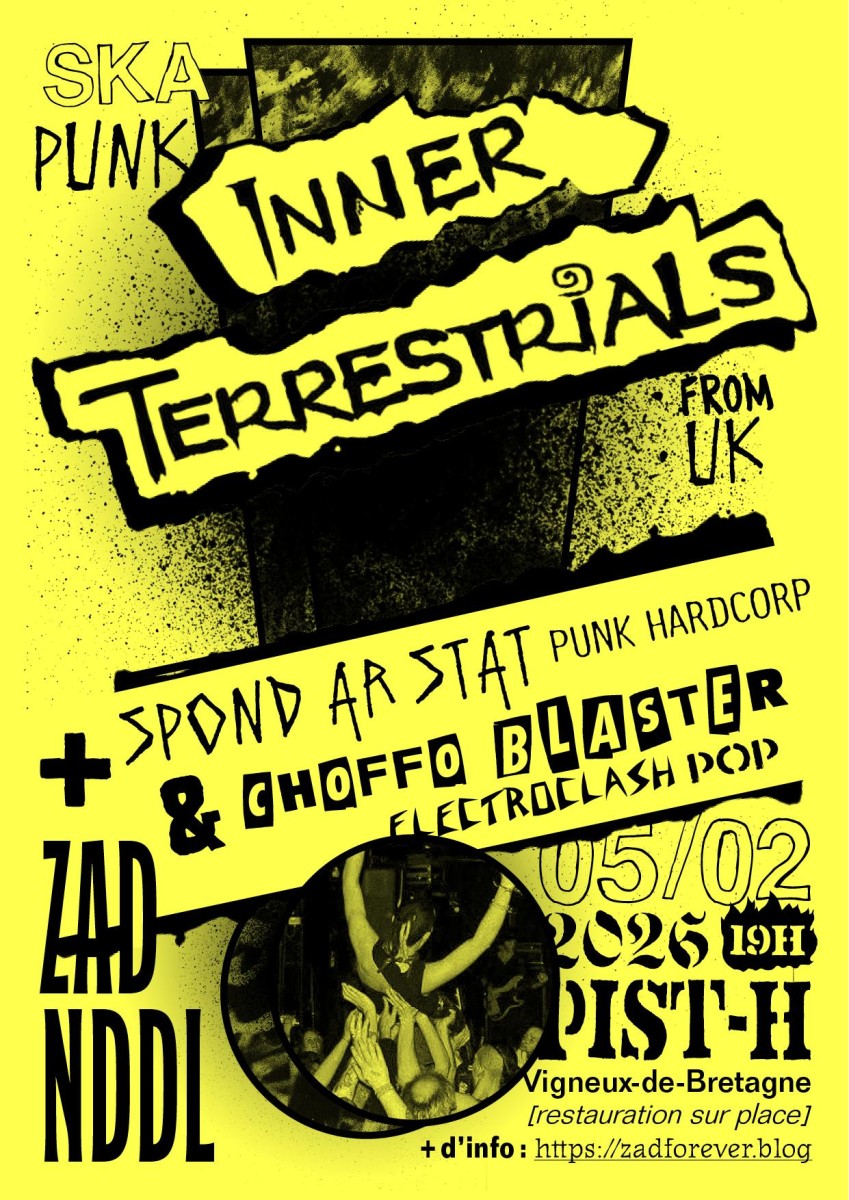Pour leur première date d’une nouvelle tournée en France, le groupe mythique de ska punk venu de Londre Inner Terrestrial sera à la Pist-h! Une première à la zad après 32 ans de tournées autant dans le milieu underground squat que sur les grandes scènes, la recette musicale d’IT reste la même, un mélange punk, dub avec une touche de hardcore pour lier toute ces ambiances avec simplicité et énergie pour donner un son monstrueux et des live de folie, les textes sont militants, droit des squatteurs, luttes écologiques, antifascistes..