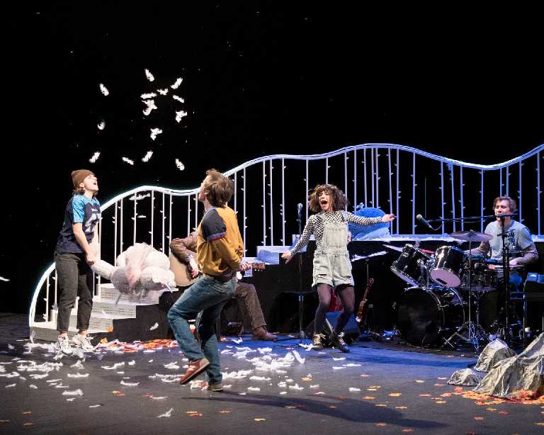 De l’enfance il y a le langage direct, franc, sans filtre qui suscite tendresse et humour. Il y a aussi un certain regard porté sur le monde, mélange de pureté et d’espoir d’un avenir meilleur. Sur scène, tout débute par les mots de Courgette et le récit de ses souvenirs. Tapis dans l’ombre, trois musiciens et une chanteuse deviennent de vrais personnages à mesure que la lumière apparaît. Le décor se dévoile, il se fait montagne, grand huit ou tribunal… Et, comme dans une pop-comédie musicale, les cinq artistes font valser rôles, costumes et instruments. C’est ingénieux, lumineux, et bien sûr émouvant.
