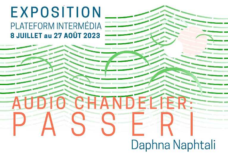 “Audio Chandelier : Passeri” est une nouvelle œuvre sonore/vidéo interactive/générative multi-canaux, créée par Dafna Naphtali, à partir d’enregistrements de chants d’oiseaux, de sa voix, de chants d’oiseaux collectés/enregistrés localement, et de données sur l’évolution des schémas de vol, de l’habitat et des chants d’oiseaux due aux changements environnementaux. L’audio sera associé à 4 canaux vidéo pour visualiser la distribution des sons, les schémas de migration des oiseaux, les chants et les sons des oiseaux. L’installation comportera des éléments interactifs pour les spectateurs/auditeurs.