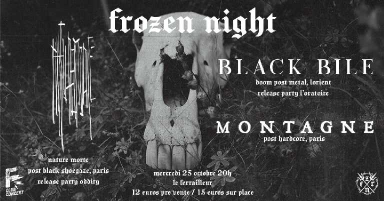 Eh oui, il y aura deux Frozen Nights en octobre ! Cette fois, on se retrouve le 25 octobre au Ferrailleur pour non pas une, mais DEUX RELEASE PARTY (est-ce qu’on dit “release parties ?”) de groupes du label avec Nature Morte (Oddity, sortie le 29 septembre) et Black Bile (L’Oratoire, sortie le 13 octobre). Montagne ouvrira la soirée, pour un chouette plateau Post-black/Post-metal/Post-hardcore.