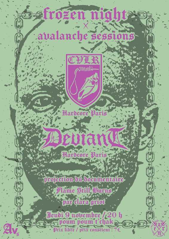 Avalanche Sessions & Frozen Records présentent : une soirée dédiée aux scènes hardcore parisiennes ! Deux concerts, avec Cavalerie et Deviant, une projection avec le documentaire Flame Still Burns de Clara Griot. Le tout à prix libre, au Poum Poum T’chak (Nantes).