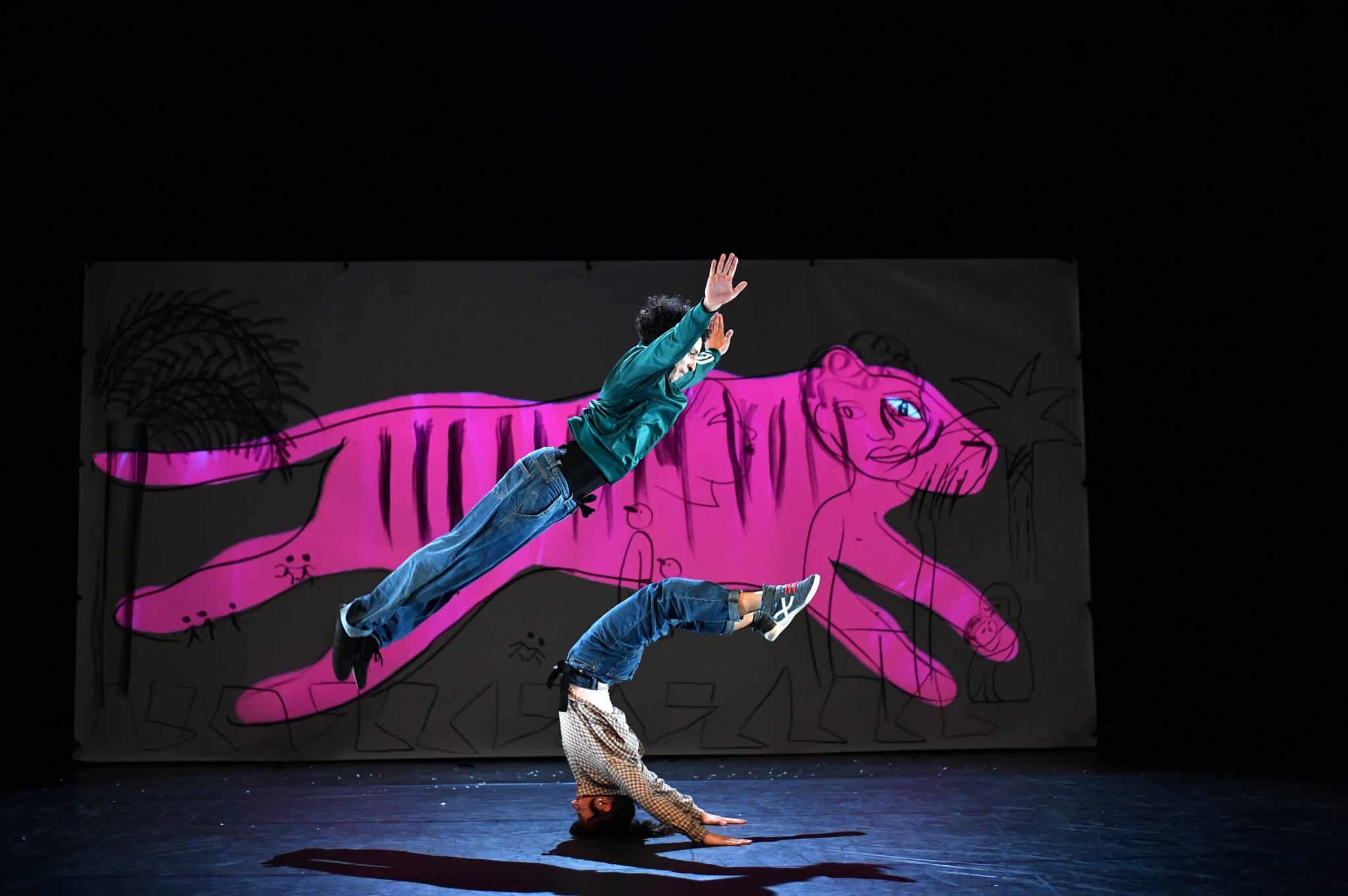 Duo de danse acrobatique à voir en famille, qui balaie les a priori dans la douceur et la joie. Il rappelle avec justesse que l’accueil et la tolérance sont les plus précieuses des richesses. Elle est « d’ici », lui d’un « là-bas ». Hichem et Marie sont inséparables dans la cour d’école, mais elle ne comprend pas la tristesse de son ami. Alors, il lui raconte le pays qu’il a fui, la guerre, les périls de l’exode. Des mots d’adultes complexes traduits dans la langue universelle des enfants : cette facilité intuitive à vivre et jouer ensemble, sans se poser de questions sur leurs origines. Leurs échanges dansés et acrobatiques dessinent une immense fresque vibrante. Les barrières tombent au rythme des textes d’Aurélie Namur et Hichem, « tigre » solitaire et résilient qui a parcouru des milliers de kilomètres, nous livre les clés de son passé.