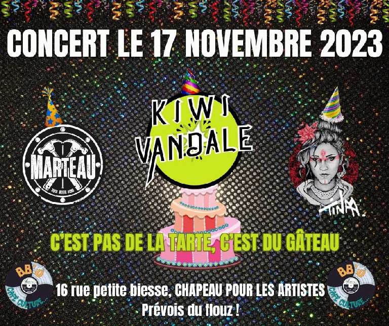 Alors venez nombreux fĂŞter cette annĂ©e de Vandalisme fabuleux Ă l’incontournable BB’O le 17 novembre 2023 ! On vous prĂ©pare une soirĂ©e de dingogo en compagnie des copaines Tinaa, Marteau et, bien sĂ»r, Kiwi Vandale !