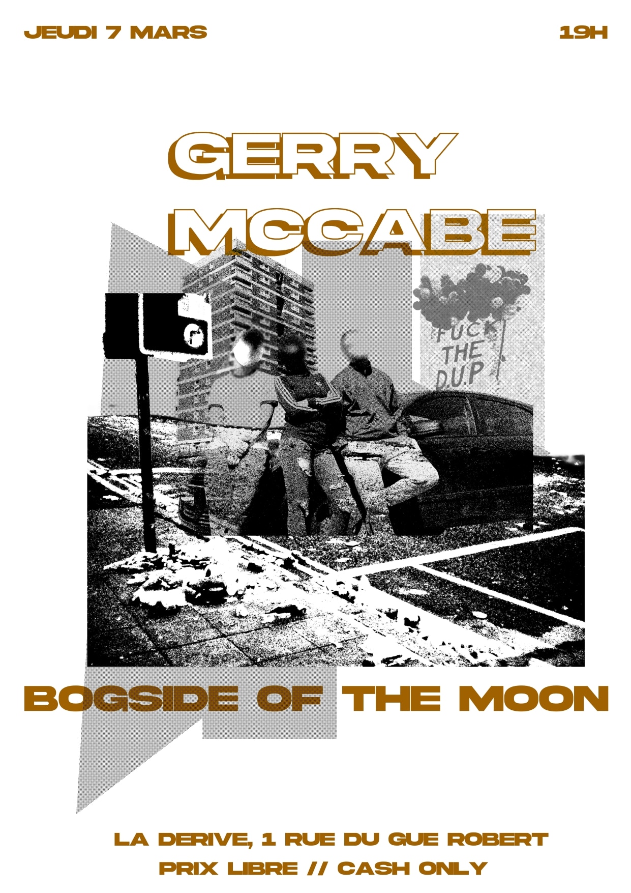 Ce projet entre le trio Bogside of the Moon et le chanteur nord-irlandais Gerry Mc Cabe est une première. Arnaud Brès, du groupe Bogside of the Moon, rencontre Gerry Mc Cabe en 1994 et se retrouve très vite à partager le quotidien (et les chansons) des habitants du quartier d’Ardoyne, nord-Belfast. Depuis une dizaine d’années, il est accompagné, dans Bogside of the Moon par Fred Boulay, au violon, figure bien connue de la scène traditionnelle, qui d’un coup d’archer virtuose fait danser reels, jigs, polka et de Mathieu Denaud, à la contrebasse, qui a su trouver, grâce au freejazz, un groove tout en liberté.