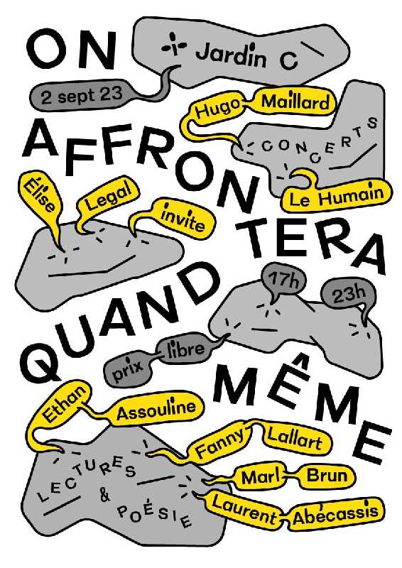 Pour sa carte blanche au Jardin C, l’artiste et autrice Élise Legal invite 4 artistes et auteur·rices à venir partager leur travail au Jardin C. Les lectures seront suivies de deux concerts de Hugo Maillard et Le Humain.