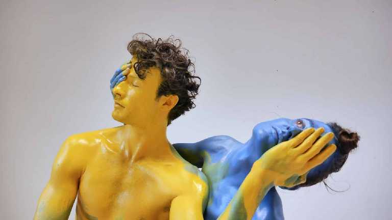 Deux corps bleu et jaune, mi-humains, mi-animaux, célèbrent l’arrivée du printemps, la renaissance du monde animal, végétal mais aussi humain ! De leur rencontre tactile surgira le vert tendre, fruit de leur mélange, et symbole d’une réjouissante métamorphose autant individuelle que collective.
