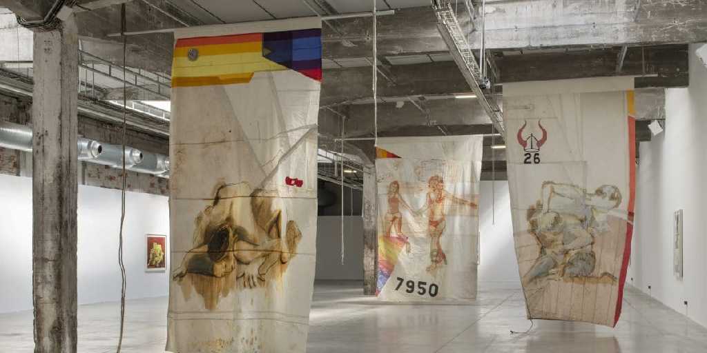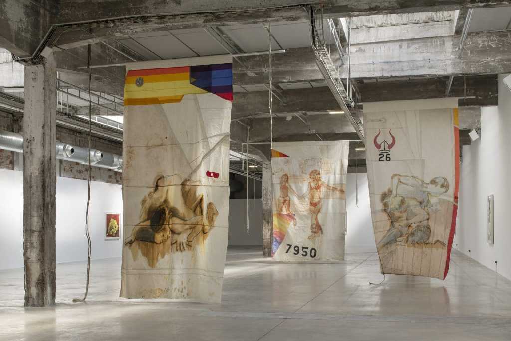 Faire des vagues, c’est l’ambition de Claire Tabouret dans sa nouvelle exposition. Attachée à Los Angeles, l’artiste s’inspire des voiles des bateaux de San Pedro pour créer une parenthèse artistique unique, voguant au gré du vent et des marées. Installées à la HAB Galerie, les voiles peintes se tendent ou se déploient quand les sculptures en plâtre restent figées, ancrées, procurant deux tonalités opposées. Mais le tout est harmonieux, les personnages sont similaires, nus et emmêlés, quand les fonds, eux, semblent inapparents. Une manière de privilégier l’humain et les corps, tordus par les voiles usées par le sel et les coups de soleil. Mais l’exposition ne serait pas complète sans les musiciens Aska Matsumiya et Alex Somers, sublimant l’océan, paisible ou déchainé. Une façon peu commune de fêter la nature.