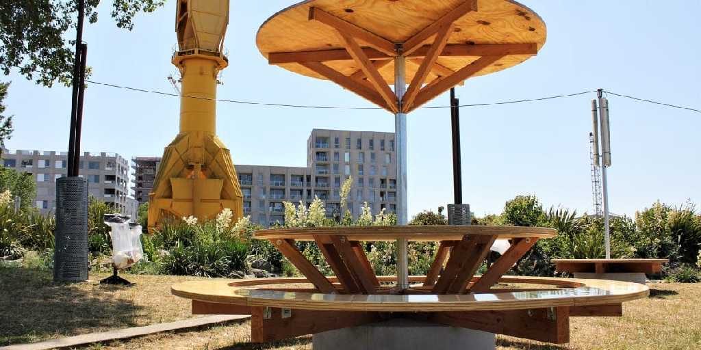 Les meules en béton sont trompeuses : non, les moissonneuses batteuses n’ont pas rasé-court les hautes herbes de la terrasse des vents, près de la grue Titan. L’œuvre de Fichtre – collectif d’architectes et plasticiens – complète l’univers industriel des chantiers navals avec du mobilier dissonant à en rendre jalouses les installations du jardin des plantes. Faites de bois et de béton, les tables s’inspirent de la forme des meules à grains dans les moulins, attisant les soirées nantaises en bord de Loire. Barbecues et hamacs sont à disposition, de quoi craner devant les retardataires du dimanche !