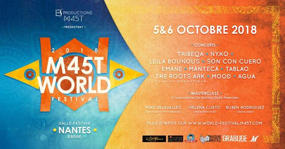 Le M45T World Festival ouvre ses portes les 5 et 6 octobre à la salle Festive Nantes Erdre(Nantes). Pour voir TribeQa Officiel, FonkyNyko LEILA BOUNOUS et bien d’autres, rendez vous sur notre Facebook (lien en dessous), LIKEZ LE POST, TAGGEZ LA PERSONNE QUI VOUS ACCOMPAGNERA ET ENVOYEZ UN MP (indispensable pour contacter les gagnants) avant lundi 10 septembre 18h.