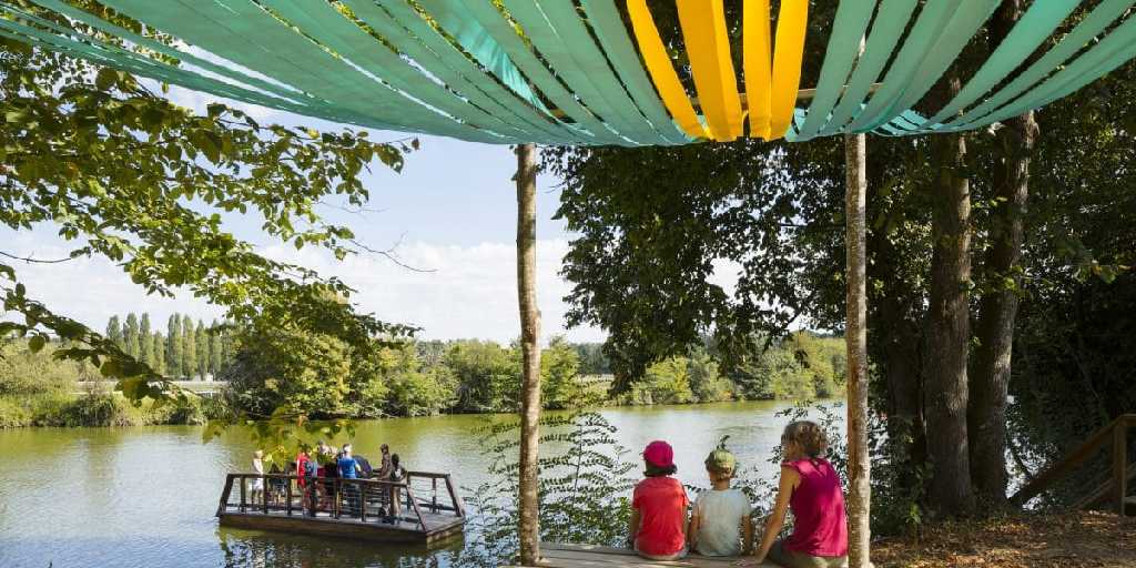 Après huit ans d’un voyage en terre urbaine et ligérienne, notre héron vogue aussi dans le vignoble, quelque peu pompette par la fragrance du muscadet. De Nantes à Clisson, il survole la Sèvre à contre-courant, une habitude tenace du Voyage à Nantes. Première étape à Vertou, au château de la Frémoire, où un bac à chaîne permet de traverser la rivière à partir de l’hippodrome. Drôle d’idée pour bronzer comme un homard en sirotant un verre au bar. Requinqué, le voyage continue vers La Haye Fouassière où un troisième « Embarquement » l’attend près du port de la commune : mobilier roulant, brouettes et jeux profitent aux (grands) enfants. Enfin, l’oiseau observe son territoire à Pont Caffino, perché sur le belvédère de l’architecte Emmanuel Ritz, quand son arrivée se fait en beauté au domaine italien de La Garenne Lemot au milieu des oeuvres néo-antiques de Cornelia Konrads : un banc arraché, des colonnes entre-liées et un match entre Hippomène et Atalante à l’entrée.