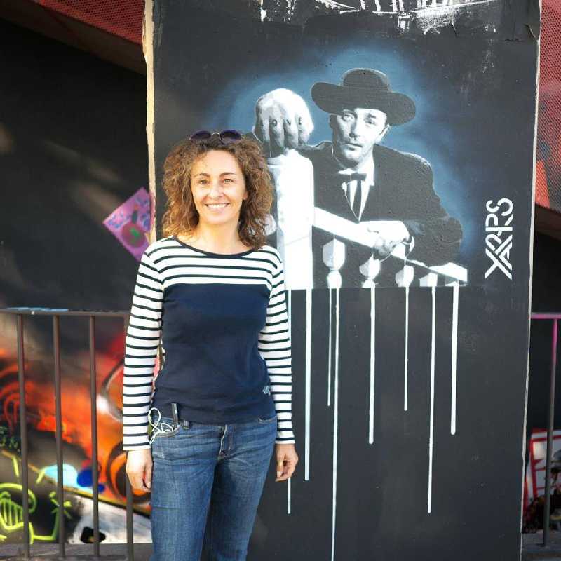 Un soir, dans une petite rue du quartier du Born à Barcelone, je suis tombée sur l’affiche du film Vivre sa Vie (de Jean-Luc Godard, 1962) reproduite à la bombe aérosol sur le rideau de fer d’un magasin. J’ai non seulement trouvé la rencontre entre ces deux arts très poétique, mais je me suis aussi demandée si cette relation avait déjà été étudiée ou au moins documentée. En me renseignant auprès des endroits spécialisés dans l’histoire du cinéma et de l’histoire de l’art, je n’ai rien trouvé, pas même un article de presse sur le sujet !