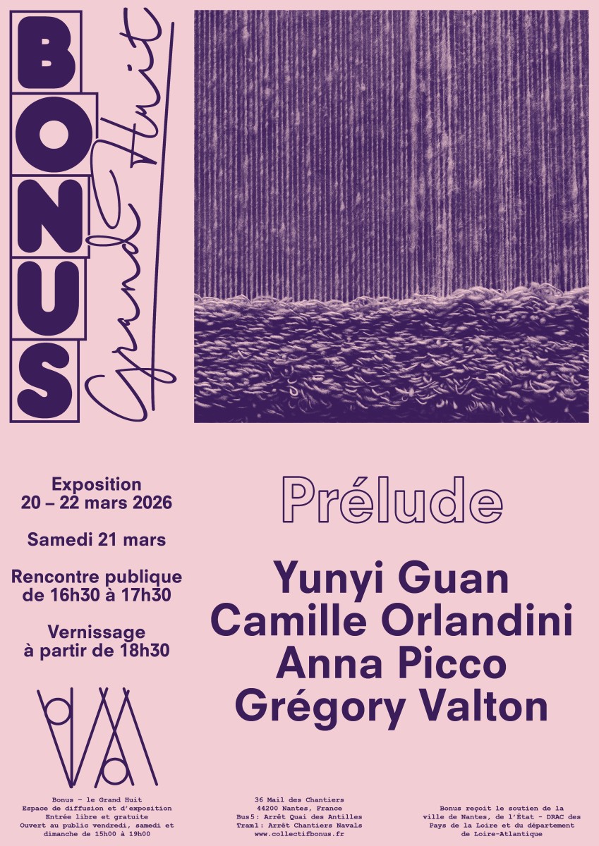 le Grand Huit 36 Mail des Chantiers, Nantes, FranceL'exposition "Prélude" regroupe les travaux de Yunyi Guan, Camille Orlandini, Anna Picco et Grégory Valton, artistes lauréat·e·s du Prix des arts visuels 2025 de la ville de Nantes, première rencontre avant celle prévue à l’Atelier durant l’été 2027. "Prélude" tente de tisser des liens entre des approches singulières qui se tiennent par le fil ténu ... Lire plus