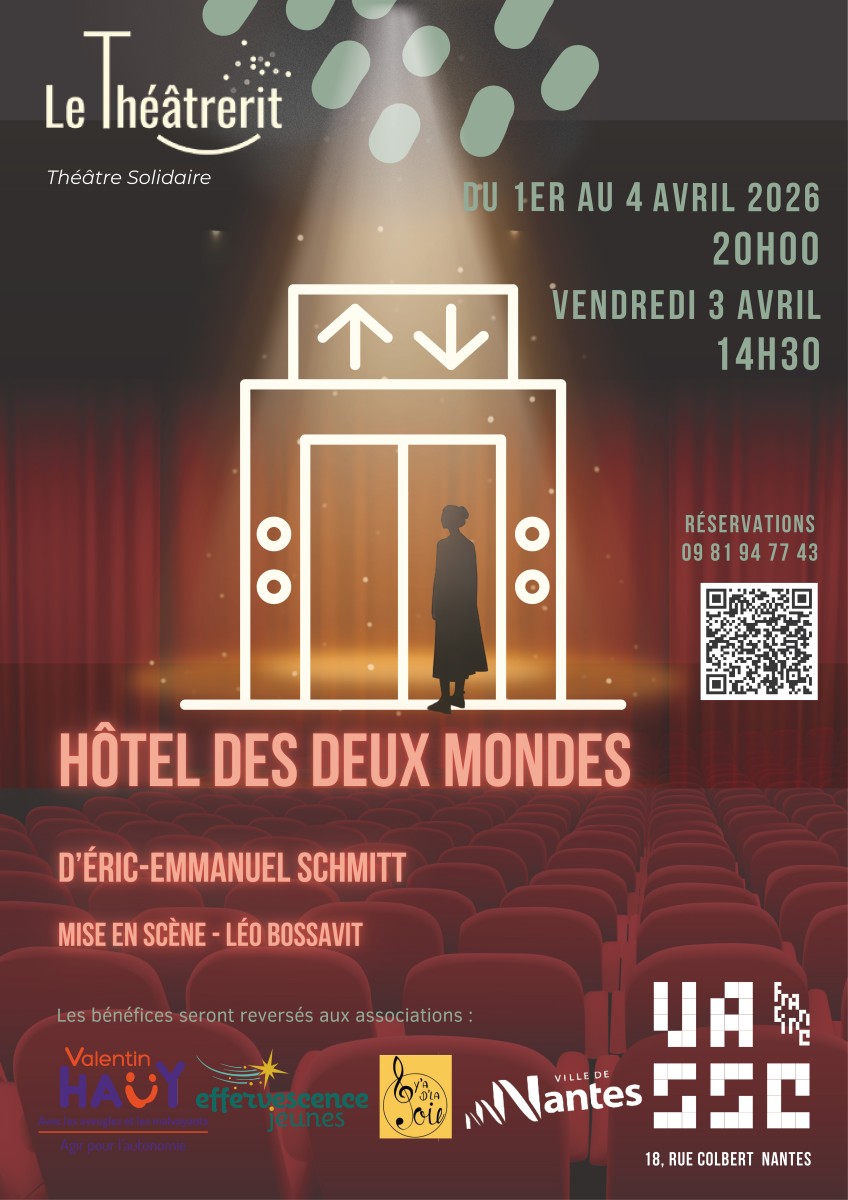 Le Théâtrerit invite le public à découvrir Hôtel des deux mondes, la pièce vibrante d'Eric-Emmanuel Schmitt, mise en scène par Léo Bossavit pour cette nouvelle saison pour prendre du plaisir et soutenir le Théâtre Solidaire. Une partie des bénéfices seront reversés à des Associations Caritatives d'Utilité Publique. Aucun client ne sait comment il est arrivé ... Lire plus