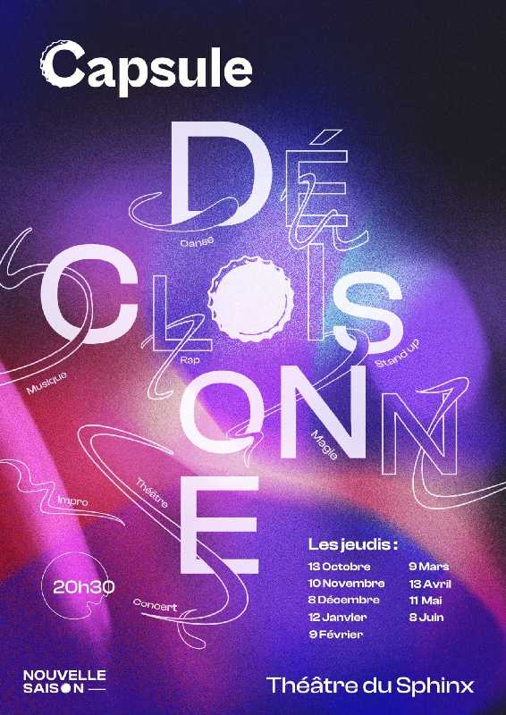 Théâtre du Sphinx 9 rue Monteil, NantesCapsule vous propose de faire un saut dans l’inconnu. Oserez-vous aller à ce spectacle où la programmation est complètement décloisonnée et dévoilée seulement sur place ? 9 propositions artistiques s’entremêlent une fois par mois pour créer un spectacle unique qui décloisonne les arts. Ce rendez-vous culturel vous offre un voyage entre les arts et une...