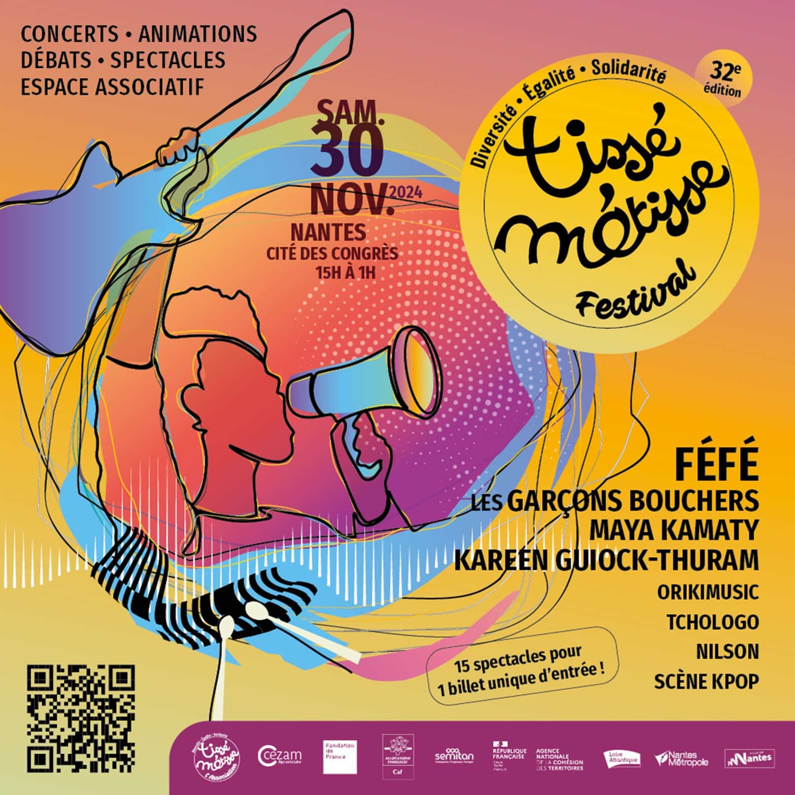 La Cité des Congrès de Nantes La Cité des Congrès de NantesTissé Métisse accueillera pour son festival le samedi 30 novembre 2024 sur la scène de la Grande Halle... Maya Kamaty, révélation éléctro-Maloya de l'Île de la Réunion ! Les Garçons Bouchers, pour un hommage à François Hadji Lazaro « TCHAO FRANÇOIS » et l'indomptable FéFé ! + 15 autres spectacles ! Des temps de débats...