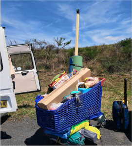 Une fois garé l’épreuve du déchargement commence : comment réussir à transporter ses tonnes de vivres et sa tonnelle de 9m² jusqu’au camping ? De mieux en mieux préparé chaque année, je recours dorénavant à toutes sortes de systèmes de poulies et autres astuces de scouts qui feraient pâlir Bear Grylls de jalousie. Admirez plutôt la beauté de ce chargement :